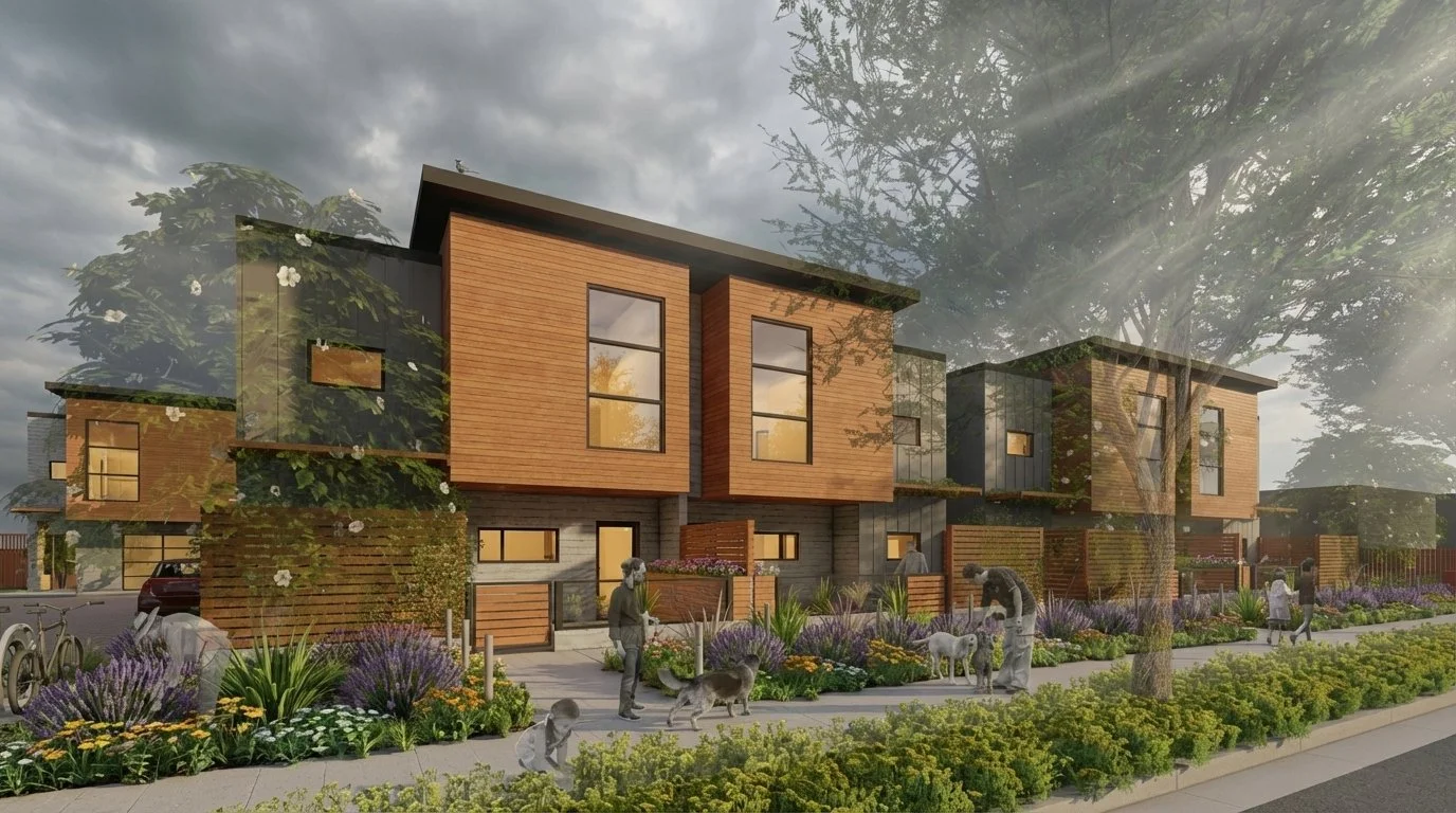 The townhouses themselves are a testament to contemporary design and efficient living. Each of the two-story homes features a blend of natural wood and linear metal siding, punctuated by trellises and expansive glazing. With approximately 1,980 square feet of living space, the three-bedroom units are optimized for both daily life and entertaining, with a strong emphasis on natural light.