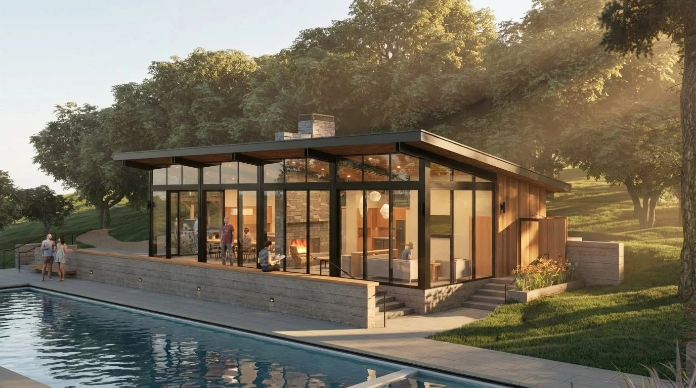 The new pool house boasts a modern design that incorporates several sustainable features. A solar array installed down the hillside supports the energy needs of this remote destination. Radiant flooring ensures comfort throughout the year, while operable windows are placed to benefit from passive cooling in the very warm summer months.
